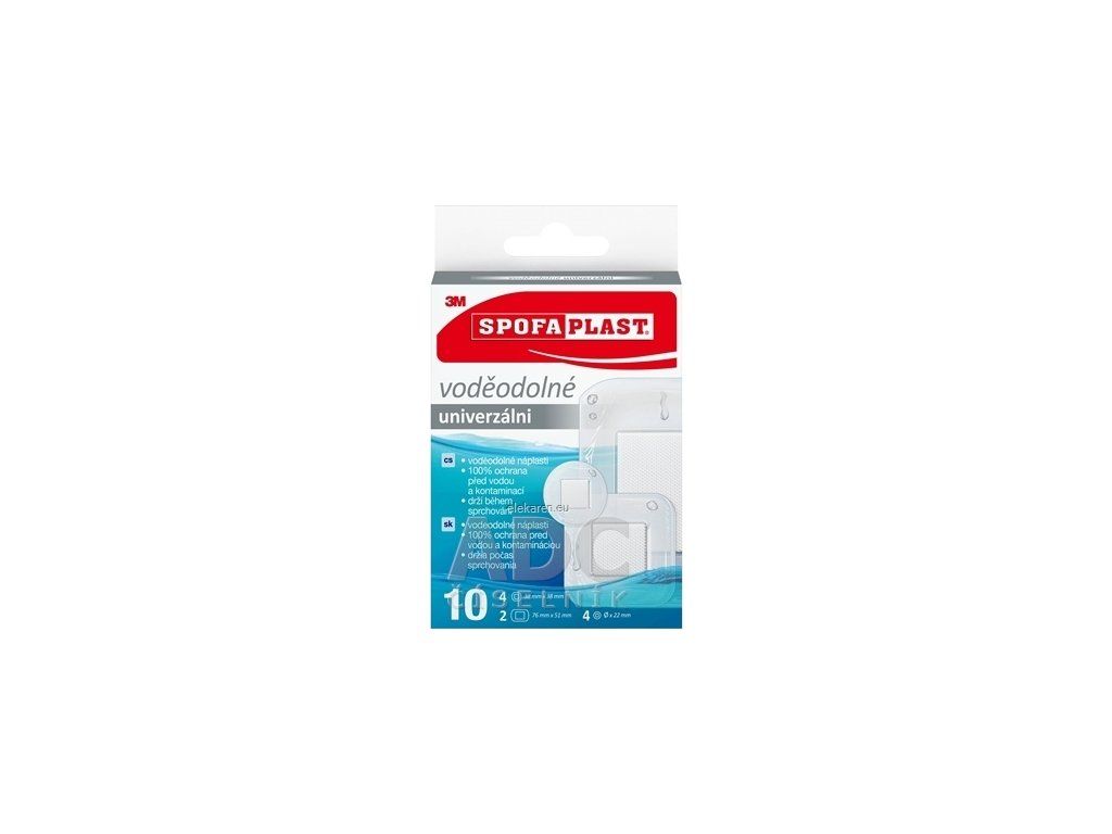 Náplasti vodeodolné. Sada náplastí vhodných na rôzne veľkosti rany. 3 rôzne veľkosti, 10 náplastí v balení: 4 ks – 38 mm x 38 mm, 2 ks – 76 mm x 51 mm, 4 ks – 22 mm