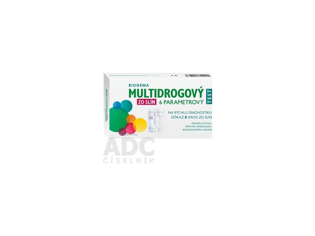 Test na rýchlu diagnostiku 6 drog zo slín. Test je vo forme nádobky a detekuje v slinách 6 najčastejšie užívaných drog a to: morfín, extázu, pervitín, marihuanu, benzodiazepín a kokaín. Viac na adc.sk