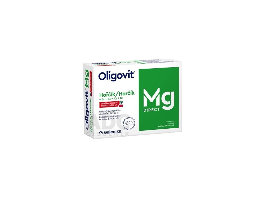 Výživový doplnok Oligovit® Mg DIRECT, prášok na priame perorálne použitie obsahuje dodatočný zdroj horčíka, vitamínu B1, B6, K2 a D3.