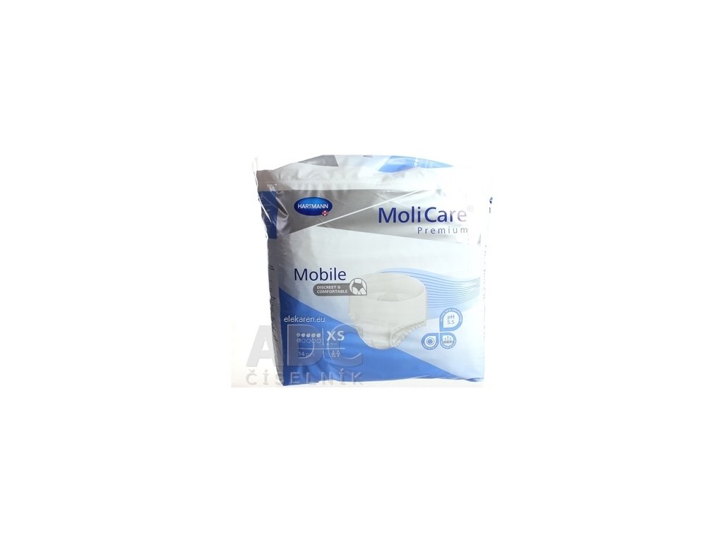 | Názov produktu podľa ŠÚKL: | Nohavičky inkontinenčné plienkové Molicare Premium Mobile 6 kv. XS / modré 45 - 70 cm, 1361 ml |