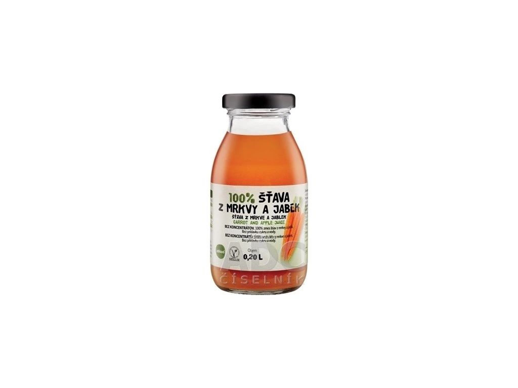 100% zmes štiav z mrkvy a jabĺk, bez konzervantov, bez pridaného cukru a vody. Obsahuje prírodné cukry. Pasterizovaná. Viac na adc.sk